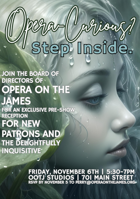 Join the Board of Directors of Opera on the James for an exclusive pre-show reception inspired by The Magic Flute. Designed for new patrons and the delightfully inquisitive, this relaxed early evening gathering offers a welcoming introduction to the world of opera—no experience required.